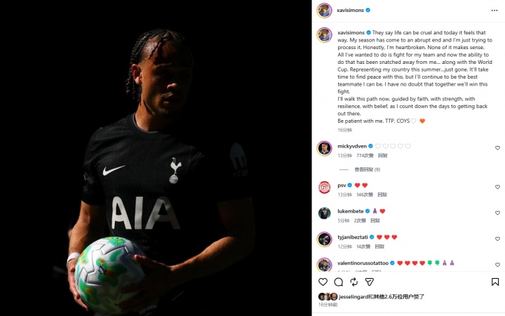 西蒙斯发文:真切体会到命运残酷,我的赛季和世界杯梦就此结束